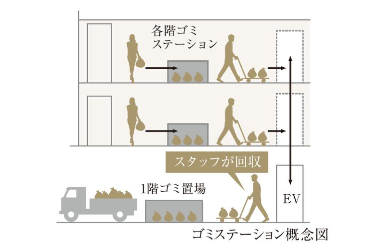 各階にゴミステーションが設置されており、24時間いつでも都合のいい時間にゴミ出しが可能です。
