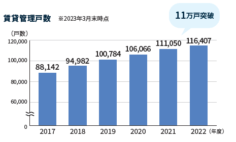 「ヘーベルメゾン」を中心に、約11万戸※の賃貸物件を管理。その戸数は年々増加しており、当社の高水準の管理業務を高く評価いただいております。管理戸数の大半は東京圏に位置し、多様なニーズに対応しています。